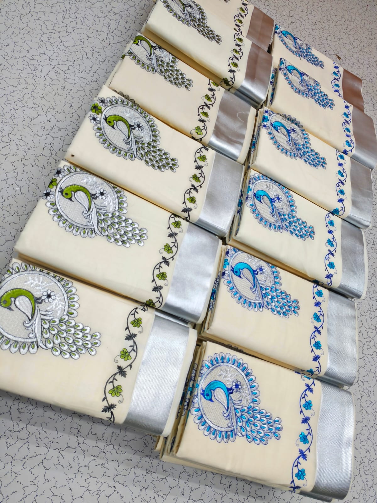 A perfect blend of Kerala tradition and modern elegance, this premium Kasavu saree comes with a shiny silver border and beautiful peacock embroidery in green & silver threads. Lightweight, elegant, and festive-ready!