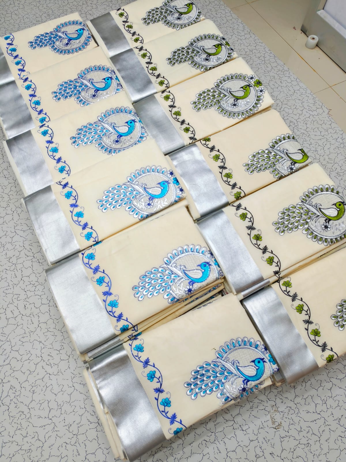 🪶 Kerala Kasavu Saree with Silver Zari & Peacock Embroidery🦚